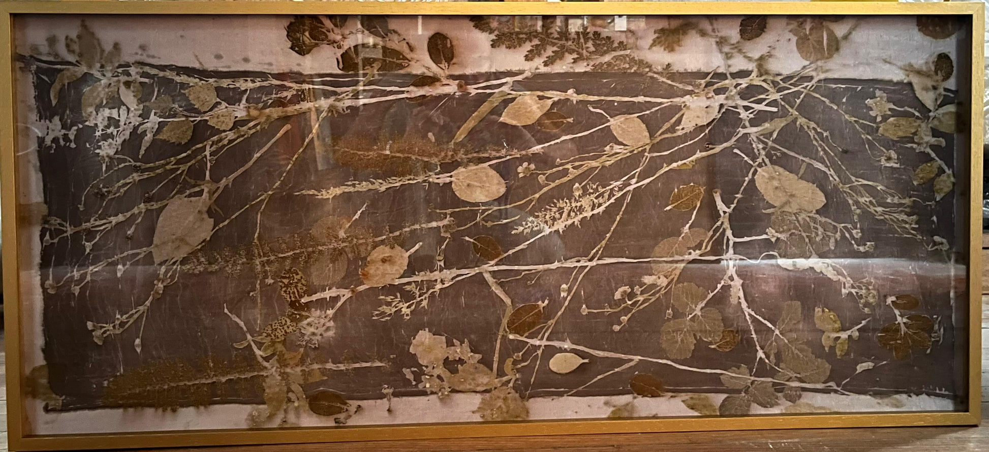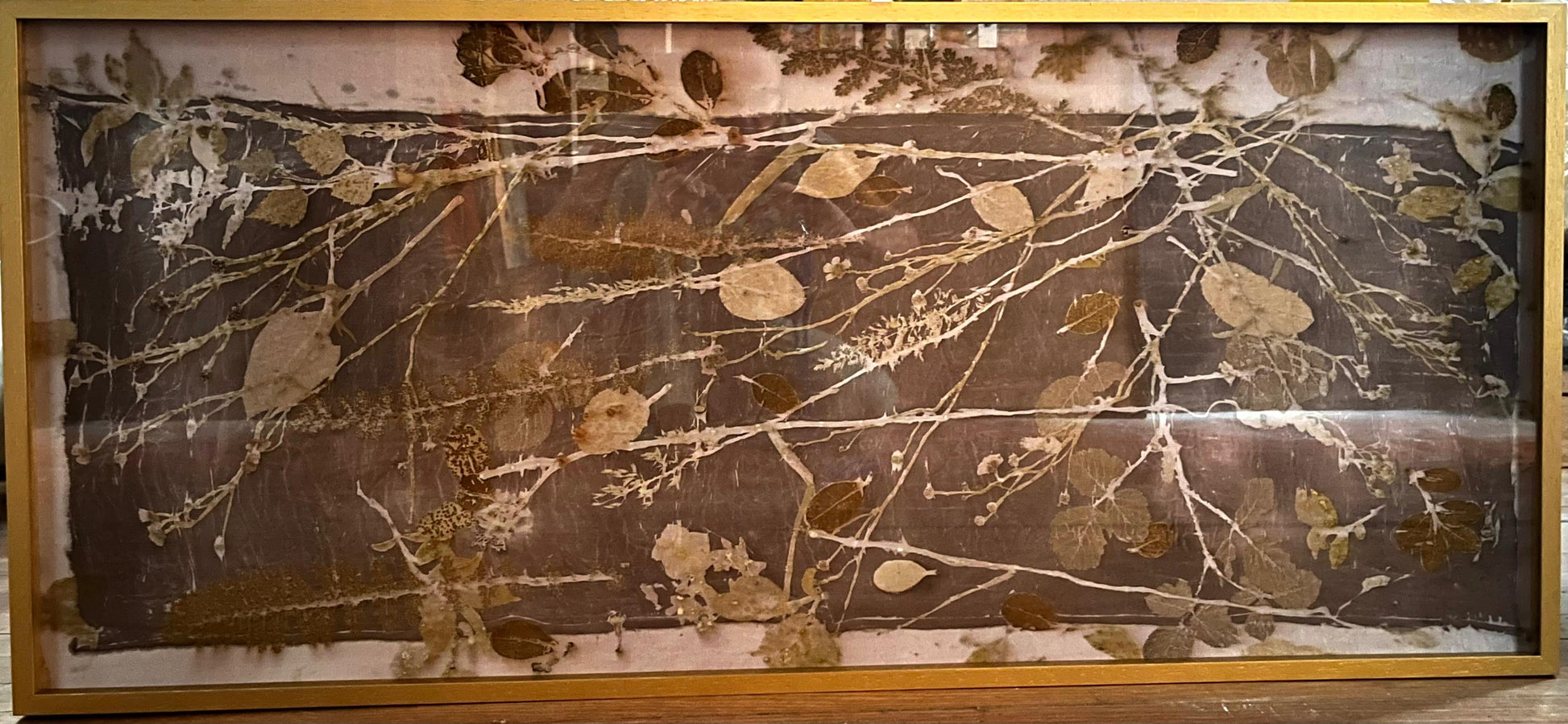 Composición botánica creada por Rossana Demarco, viscosa teñida e impresa inspirada en las praderas salvajes iluminadas por el sol del amanecer; diferentes hierbas silvestres combinadas con ramas de guayabos.